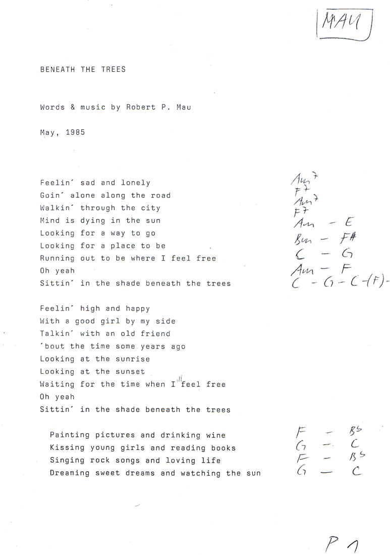 Beneath The Trees Words & music by Robert P. Mau, 1985 Rec. 1999 Produced by Hendrik Gundlach & THE BUTLERS Robert P. Mau: ld-voc., p. Robert A. Weinkauf: voc., rh-g. Frank Greif: voc., bg. Friedrich Pohl: ld-g. Hans-Dieter Schmidt: dr. [Songtext] |