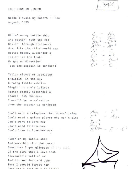 Lost Down In Lisbon Words & music by Robert P. Mau, 1999 Rec. 1999 Produced by Hendrik Gundlach & THE BUTLERS Robert P. Mau: ld-voc., org. Robert A. Weinkauf: voc., rh-g., horn Frank Greif: voc., bg., rubab Friedrich Pohl: ld-g. Hans-Dieter Schmidt: dr. Ute Lieschke: bassoon Veit Heller: positive [Songtext] |