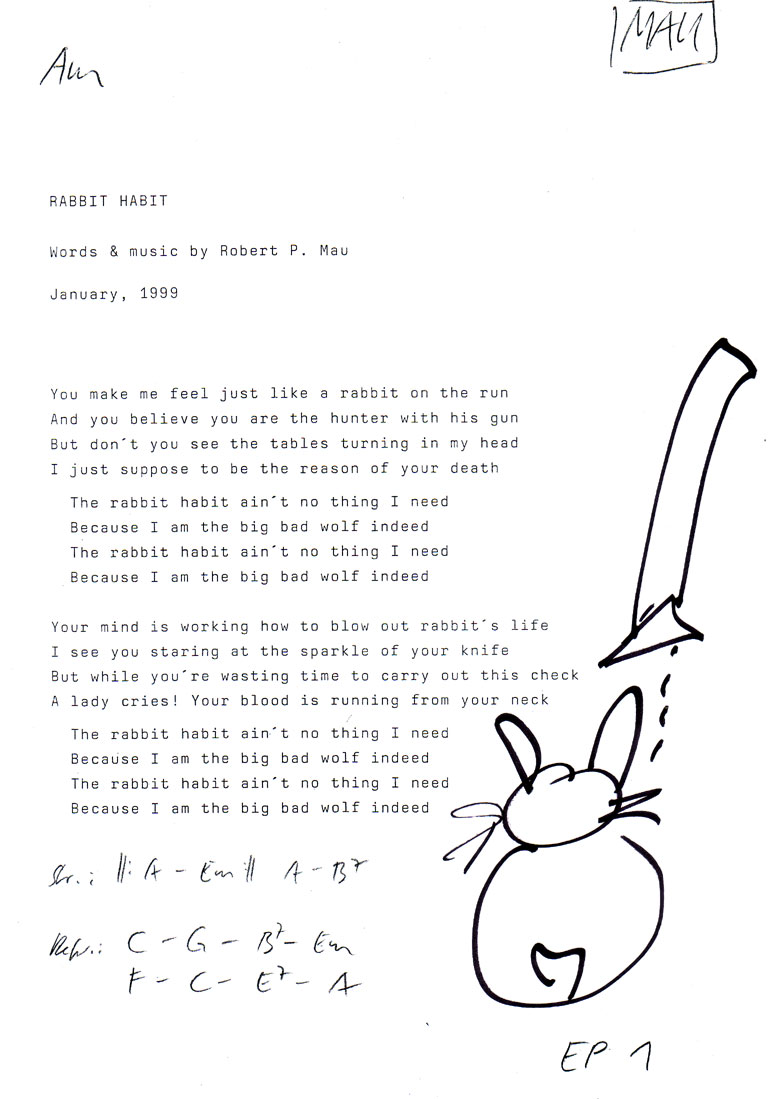 Rabbit Habbit Words & music by Robert P. Mau, 1999 Rec. 1999 Produced by Hendrik Gundlach & THE BUTLERS Robert P. Mau: ld-voc., el-p. Robert A. Weinkauf: voc., rh-g. Frank Greif: voc., bg. Friedrich Pohl: ld-g. Hans-Dieter Schmidt: dr. [Songtext] |